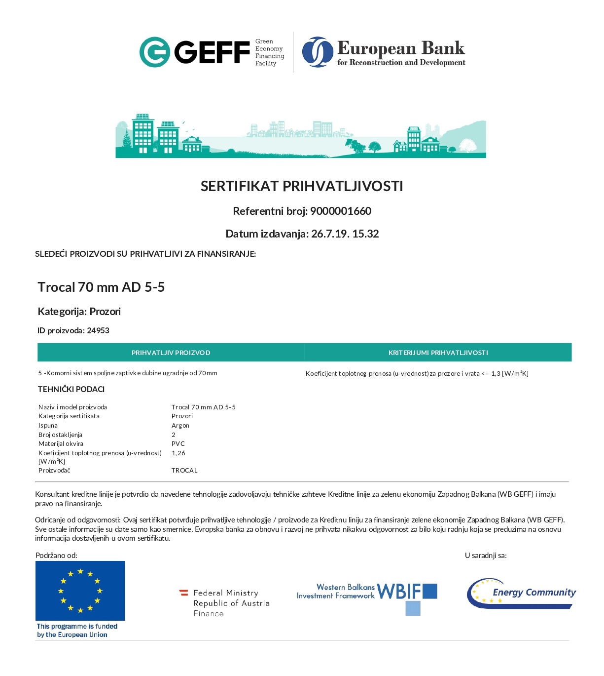 Prozorski sistemi renomirane kompanije Profine TROCAL koje imamo u ponudi ispunjavaju najviše standarde energetskih performansi i ispunjavaju uslove za konkurisanje za subvencionisani kredit GEFF.